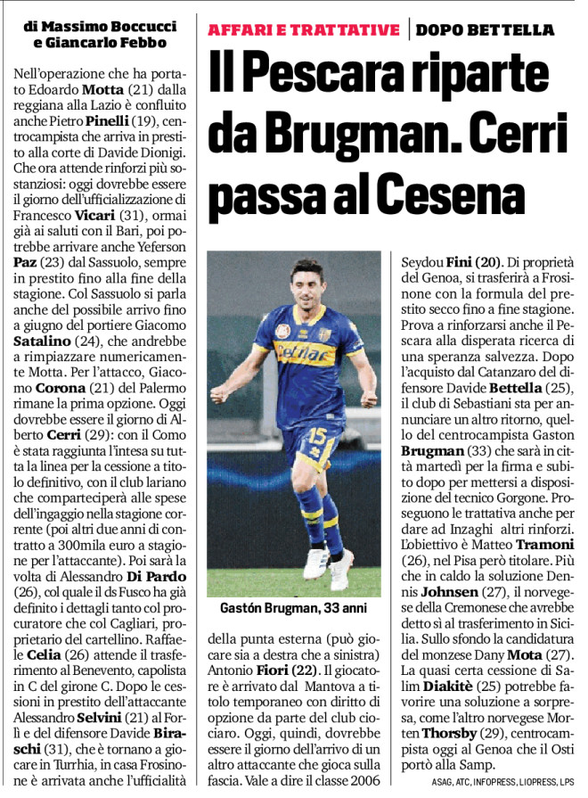 Nell’operazione che ha portato Edoardo Motta (21) dalla reggiana alla Lazio è confluito anche Pietro Pinelli (19), centrocampista che arriva in prestito alla corte di Davide Dionigi. Che ora attende rinforzi più sostanziosi: oggi dovrebbe essere il giorno dell’ufficializzazione di Francesco Vicari (31), ormai già ai saluti con il Bari, poi potrebbe arrivare anche Yeferson Paz (23) dal Sassuolo, sempre in prestito fino alla fine della stagione. Col Sassuolo si parla anche del possibile arrivo fino a giugno del portiere Giacomo Satalino (24), che andrebbe a rimpiazzare numericamente Motta. Per l’attacco, Giacomo Corona (21) del Palermo rimane la prima opzione. Oggi dovrebbe essere il giorno di Alberto Cerri (29): con il Como è stata raggiunta l’intesa su tutta la linea per la cessione a titolo definitivo, con il club lariano che comparteciperà alle spese dell’ingaggio nella stagione corrente (poi altri due anni di contratto a 300mila euro a stagione per l’attaccante). Poi sarà la volta di Alessandro Di Pardo (26), col quale il ds Fusco ha già definito i dettagli tanto col procuratore che col Cagliari, proprietario del cartellino. Raffaele Celia (26) attende il trasferimento al Benevento, capolista in C del girone C. Dopo le cessioni in prestito dell’attaccante Alessandro Selvini (21) al Forlì e del difensore Davide Biraschi (31), che è tornano a giocare in Turrhia, in casa Frosinone è arrivata anche l’ufficialità della punta esterna (può giocare sia a destra che a sinistra) Antonio Fiori (22) . Il giocatore è arrivato dal Mantova a titolo temporaneo con diritto di opzione da parte del club ciociaro. Oggi, quindi, dovrebbe essere il giorno dell’arrivo di un altro attaccante che gioca sulla fascia. Vale a dire il classe 2006 Seydou Fini (20) . Di proprietà del Genoa, si trasferirà a Frosinone con la formula del prestito secco fino a fine stagione. Prova a rinforzarsi anche il Pescara alla disperata ricerca di una speranza salvezza. Dopo l’acquisto dal Catanzaro del difensore Davide Bettella (25), il club di Sebastiani sta per annunciare un altro ritorno, quello del centrocampista Gaston Brugman (33) che sarà in città martedì per la firma e subito dopo per mettersi a disposizione del tecnico Gorgone. Proseguono le trattative anche per dare ad Inzaghi altri rinforzi. L’obiettivo è Matteo Tramoni (26), nel Pisa però titolare. Più che in caldo la soluzione Dennis Johnsen (27), il norvegese della Cremonese che avrebbe detto sì al trasferimento in Sicilia. Sullo sfondo la candidatura del monzese Dany Mota (27). La quasi certa cessione di Salim Diakitè (25) potrebbe favorire una soluzione a sorpresa, come l’altro norvegese Morten Thorsby (29), centrocampista oggi al Genoa che il Osti portò alla Samp.