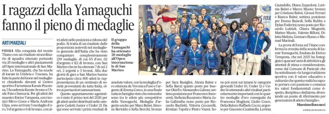 PERUGIA Alla conquista del monte Titano con un risultato straordinario di squadra ottenuto portando via 20 medaglie e altri piazzamenti all’Open internazionale di San Marino. La Yamaguchi, che ha scuole di karate in Umbria e Toscana, ha fatto la parte del leone nel medagliere chiudendo davanti al Centro sportivo Farnesiana Karate Piacenza, l’Accademia Karate Arezzo e l’Asdc Fate e Samurai. Per gli atleti del maestro Enrico Tempesta, con i tecnici Mirco Cosco e Maria Andreea Clipa, sono arrivate 5 medaglie d’oro, 9 d’argento e 6 di bronzo, con altri atleti nelle posizioni a ridosso del podio. Si tratta di un risultato dalle proporzioni notevoli nel medagliere generale dell’Italia che ha visto conquistare complessivamente 239 medaglie, di cui 65 d’oro, 62 d’argento e 112 di bronzo, con San Marino che ne ha ottenute 7 di cui 2 ori, 2 argenti e 3 bronzi. Alla due giorni di gare a San Marino hanno partecipato circa 600 atleti in rappresentanza di un centinaio di società provenienti da tutta Italia, oltre ai portacolori sammarinesi.