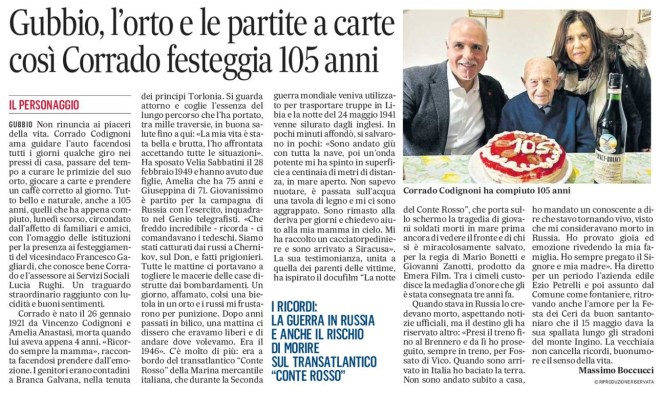 Corrado è nato il 26 gennaio 1921 da Vincenzo Codignoni e Amelia Anastasi, morta quando lui aveva appena 4 anni. «Ricordo sempre la mamma», racconta facendosi prendere dall’emozione. I genitori erano contadini a Branca Galvana, nella tenuta dei principi Torlonia. Si guarda attorno e coglie l’essenza del lungo percorso che l’ha portato, tra mille traversie, in buona salute fino a qui: «La mia vita è stata bella e brutta, l’ho affrontata accettando tutte le situazioni”. Ha sposato Velia Sabbatini il 28 febbraio 1949 e hanno avuto due figlie, Amelia che ha 75 anni e Giuseppina di 71. Giovanissimo, è partito per la campagna di Russia con l’esercito, inquadrato nel Genio telegrafisti. «Che freddo incredibile – ricorda -, ci comandavano i tedeschi. Siamo stati catturati dai russi a Chernikov, sul Don, e fatti prigionieri. Tutte le mattine ci portavano a togliere le macerie delle case distrutte dai bombardamenti. Un giorno, affamato, colsi una bietola in un orto e i russi mi frustarono per punizione. Dopo anni passati in bilico, una mattina ci dissero che eravamo liberi di andare dove volevamo. Era il 1946». C’è molto di più: era a bordo del transatlantico “Conte Rosso” della Marina mercantile italiana, che durante la Seconda guerra mondiale veniva utilizzato per trasportare truppe in Libia e la notte del 24 maggio 1941 venne silurato dagli inglesi. In pochi minuti affondò, si salvarono in pochi: «»Sono andato giù con tutta la nave, poi un’onda potente mi ha spinto in superficie a centinaia di metri di distanza, in mare aperto. Non sapevo nuotare, è passata sull’acqua una tavola di legno e mi ci sono aggrappato. Sono rimasto alla deriva per giorni e chiedevo aiuto alla mia mamma in cielo. Mi ha raccolto un cacciatorpediniere e sono arrivato a Siracusa». La sua testimonianza, unita a quella dei parenti delle vittime, ha ispirato il docufilm “La notte del Conte Rosso”, che porta sullo schermo la tragedia di giovani soldati morti in mare prima ancora di vedere il fronte e di chi si è miracolosamente salvato, per la regia di Mario Bonetti e Giovanni Zanotti, prodotto da Emera Film. Tra i cimeli custodisce la medaglia d’onore che gli è stata consegnata tre anni fa. Quando stava in Russia lo credevano morto, aspettando notizie ufficiali, ma il destino gli ha riservato altro: «Presi il treno fino al Brennero e da lì ho proseguito, sempre in treno, per Fossato di Vico. Quando sono arrivato in Italia ho baciato la terra. Non sono andato subito a casa, ho mandato un conoscente a dire che stavo tornando vivo, visto che mi consideravano morto in Russia. Ho provato gioia ed emozione rivedendo la mia famiglia. Ho sempre pregato il Signore e mia madre». Ha diretto per un periodo l’azienda edile Ezio Petrelli e poi assunto dal Comune come fontaniere, ritrovando anche l’amore per la Festa dei Ceri da buon santantoniaro che il 15 maggio dava la sua spallata lungo gli stradoni del monte Ingino. La vecchiaia non cancella ricordi, buonumore e il senso della vita.
