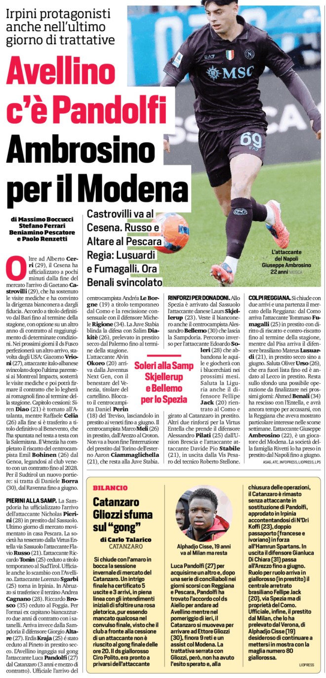 PIERINI ALLA SAMP. La Sampdoria ha ufficializzato l’arrivo dell’attaccante Nicholas Pierini (28) in prestito dal Sassuolo. Ultimo giorno di mercato movimentato in casa Pescara. La società ha tesserato dalla Virtus Entella via Sassuolo l’attaccante Flavio Russo (21). L’attaccante Riccardo Tonin (25) ceduto a titolo temporaneo al SudTirol. Ufficiale anche lo scambio con l’Avellino. L’attaccante Lorenzo Sgarbi (25) torna in Irpinia. In Abruzzo si trasferisce il terzino Andrea Cagnano (28). Riccardo Brosco (35) ceduto al Foggia. Per l’ormai ex capitano biancazzurro due anni di contratto con i satanelli. Arriva invece dalla Sampdoria il difensore Giorgio Altare (27). Erdis Kraja (25) é stato ceduto al Pineto in prestito secco. L’Avellino ingaggia sul gong l’attaccante Luca Pandolfi (27) dal Catanzaro (3 anni e mezzo di contratto). Ufficiale l’arrivo del centrocampista Andréa Le Borgne (19) a titolo temporaneo dal Como e la rescissione consensuale con il difensore Michele Rigione (34). La Juve Stabia blinda la difesa con Salim Diakitè (26), prelevato in prestito secco dal Palermo fino al termine della stagione. L’attaccante Alvin Okoro (20) arriva dalla Juventus Next Gen, con il benestare del Venezia, titolare del cartellino. Bloccato il centrocampista Daniel Perin (18) del Treviso, lasciandolo in prestito ai veneti fino a giugno. Il centrocampista Marco Meli (26) in prestito, dall’Arezzo al Croton. Non va a buon fine l’interruzione del prestito dal Torino dell’esterno Aaron Ciammaglichella (21), che resta alla Juve Stabia.