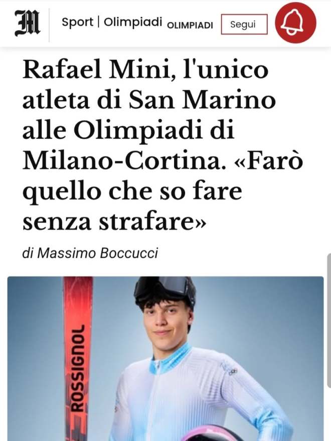 Il Comitato olimpico nazionale sammarinese (Cons) prende il meglio dall’avventura che verrà: «La qualificazione di Rafael Mini rappresenta un risultato molto importante – spiega il presidente Christian Forcellini – per il nostro movimento sportivo. Essere presenti a una manifestazione olimpica che si svolge in Italia ci offre un’opportunità straordinaria in termini di visibilità e immagine, permettendoci di trasmettere un messaggio positivo e sano del nostro Paese. Questa partecipazione è per noi un’occasione da valorizzare al massimo, non solo per sostenere il nostro atleta ma anche per far conoscere San Marino nel contesto degli sport invernali a livello internazionale. Allo stesso tempo, è fondamentale continuare a lavorare con una visione di lungo periodo, affinché in futuro sia possibile ampliare il numero di discipline rappresentate. Le Olimpiadi sono un’opportunità che non può e non deve essere limitata a una sola specialità come lo sci alpino, ma va colta nella sua totalità».