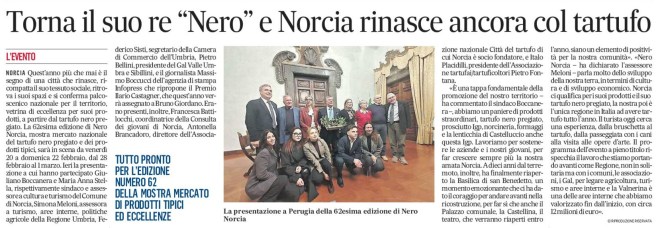 NORCIA Quest’anno più che mai è il segno di una città che rinasce, ricompatta il suo tessuto sociale, ritrova i suoi spazi e si conferma palcoscenico nazionale per il territorio, vetrina di eccellenza per suoi prodotti, a partire dal tartufo nero pregiato. La 62esima edizione di Nero Norcia, mostra mercato nazionale del tartufo nero pregiato e dei prodotti tipici, sarà in scena da venerdì 20 a domenica 22 febbraio, dal 28 febbraio al 1 marzo, ed è stata presentata a Perugia giovedì 5 febbraio. All’incontro hanno partecipato Giuliano Boccanera e Maria Anna Stella, rispettivamente sindaco e assessore a cultura e turismo del Comune di Norcia, Simona Meloni, assessora a turismo, aree interne, politiche agricole della Regione Umbria, Federico Sisti, segretario della Camera di Commercio dell’Umbria, Pietro Bellini, presidente del Gal Valle Umbra e Sibillini, e il giornalista Massimo Boccucci dell’agenzia di stampa Infopress che ripropone, venerdì 27 febbraio, il Premio Ilario Castagner, gradita conferma nel programma dopo il successo della prima edizione, che quest’anno verrà assegnato a Bruno Giordano, ex centroavanti della Lazio oggi apprezzato giornalista sportivo. Erano presenti, inoltre, Francesca Battilocchi, coordinatrice della Consulta dei giovani di Norcia, neonata e attiva realtà del territorio che ha curato alcune iniziative in cartellone, Antonella Brancadoro, direttore dell’Associazione nazionale Città del tartufo di cui Norcia è socio fondatore, e Italo Placidilli, presidente dell’Associazione tartufai/tartuficoltori ‘Pietro Fontana’, tra gli organizzatori, insieme a Fita, della tavola rotonda ‘La salvaguardia e la coltivazione del tartufo nero pregiato’ (sabato 21 febbraio alle 15, Spazio Digipass).