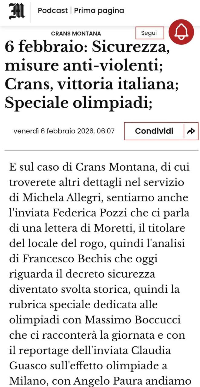 Sul campo, ottimo esordio ieri per Stefania Constantini e Amos Mosaner, che contro la Corea del Sud hanno vinto il primo match nel doppio misto del torneo olimpico di curling. Debutto col botto per l’Italdonne che nell’hockey ha battuto la Francia per 4-1 all’Arena Santagiulia davanti a 9.356 spettatori. Oggi continueranno il round robin del doppio misto di curling e il torneo di hockey su ghiaccio femminile. Si terranno anche ulteriori allenamenti ufficiali di salto con gli sci e prove cronometrate di sci alpino e slittino, infine inizierà il programma del pattinaggio artistico.