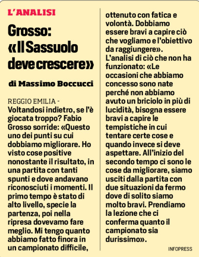REGGIO EMILIA – Voltandosi indietro, se l’è giocata troppo? Fabio Grosso sorride: «Questo uno dei punti su cui dobbiamo migliorare. Ho visto cose positive nonostante il risultato, in una partita con tanti spunti e dove andavano riconosciuti i momenti. Il primo tempo è stato di alto livello, specie la partenza, poi nella ripresa dovevamo fare meglio. Mi tengo quanto abbiamo fatto finora in un campionato difficile, ottenuto con fatica e volontà. Dobbiamo essere bravi a capire ciò che vogliamo e l’obiettivo da raggiungere». L’analisi di ciò che non ha funzionato: «Le occasioni che abbiamo concesso sono nate perché non abbiamo avuto un briciolo in più di lucidità, bisogna essere bravi a capire le tempistiche in cui tentare certe cose e quando invece si deve aspettare. All’inizio del secondo tempo ci sono le cose da migliorare, siamo usciti dalla partita con due situazioni da fermo dove di solito siamo molto bravi. Prendiamo la lezione che ci conferma quanto il campionato sia durissimo».