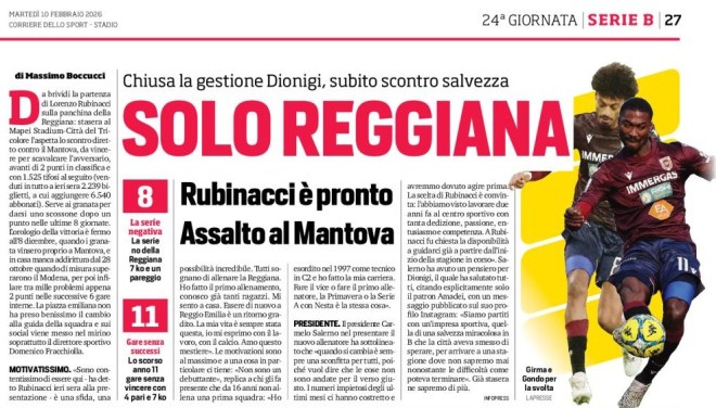 Da brividi la partenza di Lorenzo Rubinacci sulla panchina della Reggiana: stasera al Mapei Stadium-Città del Tricolore l’aspetta lo scontro diretto contro il Mantova, da vincere per scavalcare l’avversario, avanti di 2 punti in classifica e con 1.525 tifosi al seguito (venduti in tutto a ieri sera 2.239 biglietti, a cui aggiungere 6.540 abbonati). Serve ai granata per darsi uno scossone dopo un punto nelle ultime 8 giornate. L’orologio della vittoria è fermo all’8 dicembre, quando i granata vinsero proprio a Mantova, e in casa manca addirittura dal 28 ottobre quando di misura superarono il Modena, per poi infilare tra mille problemi appena 2 punti nelle successive 6 gare interne. La piazza emiliana non ha preso benissimo il cambio alla guida della squadra e sui social viene messo nel mirino soprattutto il direttore sportivo Domenico Fracchiolla.