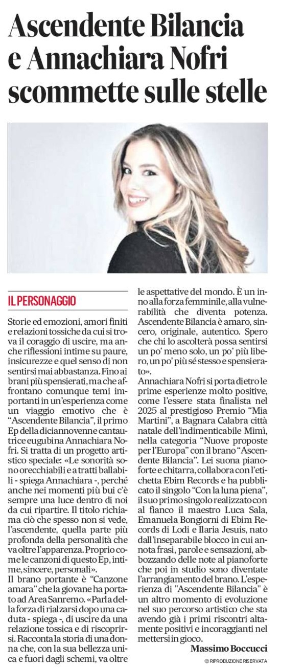 Annachiara Nofri si porta dietro le prime esperienze molto positive, come l’essere stata finalista nel 2025 al prestigioso Premio “Mia Martini”, a Bagnara Calabra città natale dell’indimenticabile Mimì, nella categoria “Nuove proposte per l’Europa” con il brano “Ascendente Bilancia”. Lei suona pianoforte e chitarra, collabora con l’etichetta Ebim Records e ha pubblicato il singolo “Con la luna piena”, il suo primo singolo realizzato con al fianco il maestro Luca Sala, Emanuela Bongiorni di Ebim Records di Lodi e Ilaria Jesuis, nato dall’inseparabile blocco in cui annota frasi, parole e sensazioni, abbozzando delle note al pianoforte che poi in studio sono diventate l’arrangiamento del brano. L’esperienza di “Ascendente Bilancia” è un altro momento di evoluzione nel suo percorso artistico che sta avendo già i primi riscontri altamente positivi e incoraggianti nel mettersi in gioco.
