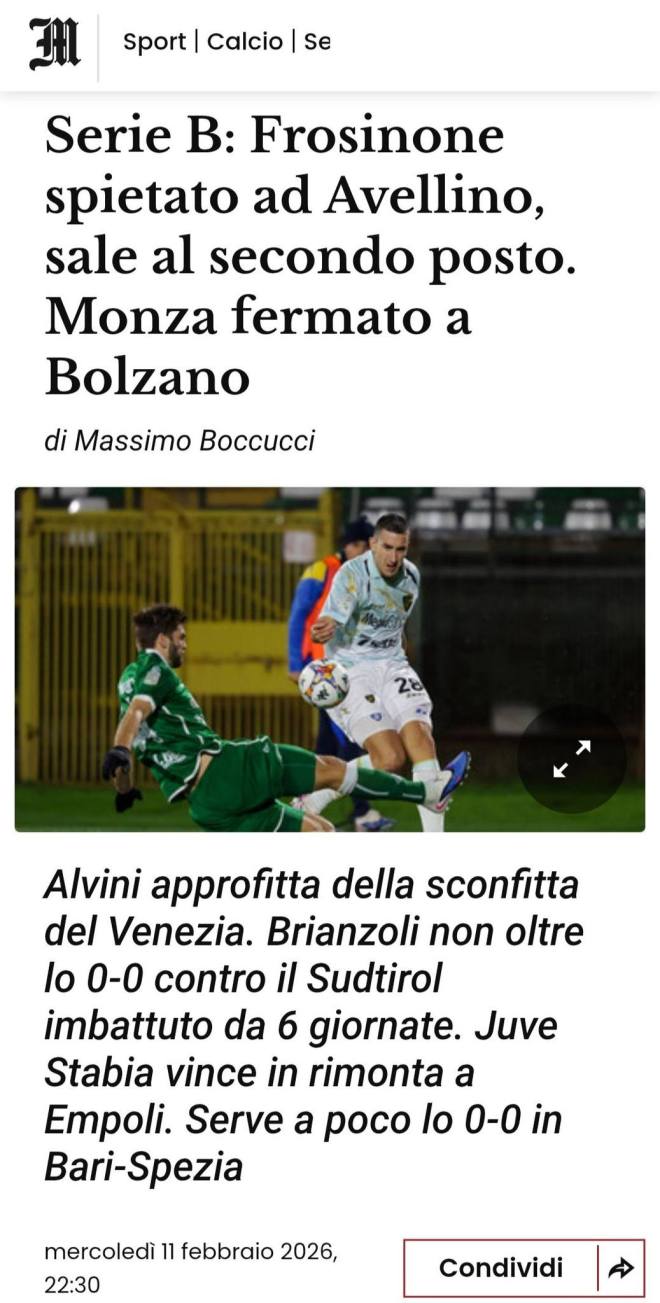 Solo il Frosinone, vittorioso per 3-1 ad Avellino, ha approfittato a piene mani della sconfitta del Venezia in casa con il Modena per salire al 2° posto in classifica, scavalcando il Monza bloccato a Bolzano sullo 0-0. Questo ha sancito il turno infrasettimanale in Serie B, con la 24ª giornata. La squadra di Massimiliano Alvini al Partenio-Lombardi ha gestito la buona partenza degli irpini per poi incanalare il successo con 2 gol in 10 minuti dal 16’ quando Oyono entra in area e serve Kvernadze, che tutto solo controlla e di piatto supera Daffara. Poi, il cross da destra di Ghedjemis per Calò solo in area che calcia al volo: il portiere respinge ma non può nulla sulla ribattuta. Nella ripresa al 16’ ecco il tris con una ripartenza veloce: Zilli riceve palla sulla sinistra e mette al centro per Cichella che in scivolata non perdona. L’Avellino, che incassa 2 ko di fila dopo un pareggio, segna al 32’ con Enrici di testa sull’angolo di Russo.