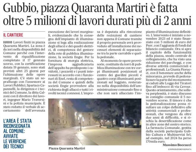 Al momento le opere provvisorie, costituite da torri di pubblica illuminazione con tre corpi illuminanti posizionati al centro dei giardini piccoli e quattro corpi illuminanti posizionati sul loggiato, resteranno nella disponibilità dell’amministrazione comunale fino a che non sarà allacciato l’impianto d’illuminazione definitivo. L’intervento è iniziato a novembre 2023 ed è stato finanziato con 5 milioni di euro dai fondi del Pnrr, con l’aggiunta di altri 400mila euro dal bilancio comunale. Ora si apre il capitolo della funzionalità della piazza, snodo centrale di collegamento viario, che ha visto una drastica riduzione dei parcheggi, e con diverse attività commerciali e professionali. La Giunta Fiorucci, con il benestare anche della minoranza, prevede di pedonalizzare la parte dal monumento ai caduti alle Logge dei Tiratori fino all’imbocco di via Cavour. Questo orientamento, che solleva perplessità e polemiche, è stato discusso in consiglio comunale il 5 novembre scorso. Il timore diffuso è che la pedonalizzazione possa risultare un colpo definitivo alle attività commerciali e professionali di quell’area, che vengono da oltre due di difficoltà, e potrebbe prospettare la desertificazione come succede in altre zone del centro storico. Il Comune, per esempio, fa la conta dei danni perché la farmacia Comunale, gestita dalla società partecipata Gubbio Cultura e Multiservizi Srl, nel 2024 ha perso 170mila euro.