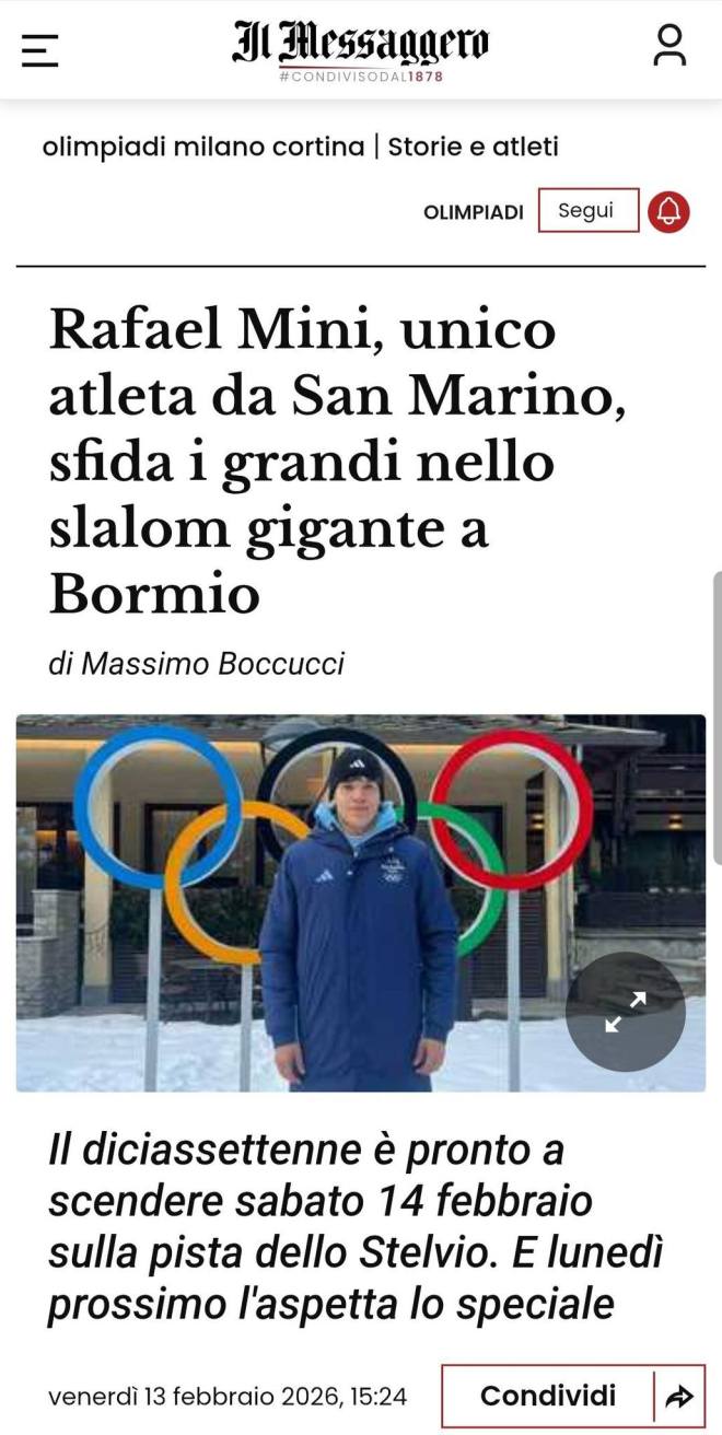 SAN MARINO – Prontissimo a mettersi in gioco, deciso a lasciarsi andare sulla pista dello Stelvio Ski Center a Bormio dove domattina (sabato 14 febbraio), dalle 10.30, andrà in scena lo slalom gigante e Rafael Mini se lo vuole godere fino in fondo. Il diciassettenne è l’unico atleta della Repubblica di San Marino alle Olimpiadi invernali di Milano-Cortina 2026. Si è qualificato per questa gara e per lo slalom speciale di lunedì prossimo, 16 febbraio, sempre sulla pista di Bormio. Passa con tutta la naturalezza dalla serata magica della cerimonia d’apertura tra Livigno, dove ha sfilato, e Milano dove a San Siro le immagini sono state rilanciate mentre facevano il giro del mondo, all’adrenalina della pista.