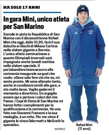 Scende in pista la Repubblica di San Marino con il diciassettenne Rafael Mini che oggi, dalle 10.30, farà il suo debutto ai Giochi di Milano Cortina nello slalom gigante a Bormio. L’unico atleta sammarinese a queste Olimpiadi invernali sarà impegnato anche lunedì mattina nello slalom speciale. Il portabandiera biancazzurro alla cerimonia inaugurale sa quel che vuole: «Devo solo fare ciò che so, mi sento pronto. Mi sono allenato tanto, anche in condizioni simili alla gara, e sto molto bene. Voglio godermi il momento e divertirmi. Un orgoglio essere qui e portare i colori del mio Paese. I Capi di Stato di San Marino mi hanno fatto i complimenti per la qualificazione e la cerimonia. Ho una foto con Giovanni Franzoni e la sua medaglia, è un mito. Per me vince il gigante lo vince Odermatt e McGrath lo speciale».