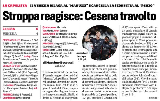 È bastato stuzzicarlo per vedere il Venezia reagire: vittoria 4-0 al “Manuzzi”, dopo il ko al “Penzo” col Modena, davanti al Cesena che resta al buio col 4° ko in 5 gare. Il finale del 1° tempo spacca la gara che i lagunari avevano interpretato meglio. Il fallo al limite su Yeboah di Mangraviti (ammonito, salterà lo Spezia) ispira Busio che fa una punizione-capolavoro col destro all’incrocio per la 6ª rete. Prima della pausa il raddoppio con lo scatto di Doumbia a destra, Bisoli che non riesce a fermare l’azione e il sinistro svirgolato di Yeboah che diventa un assist per Adorante, implacabile da 2 passi per il suo 12° gol. Stordito il Cesena, che al 17’ aveva perso Castrovilli per un guaio muscolare. Il Venezia manda presto segnali e al 19’ Sagrado impegna Klinsmann. Mignani spera in Cerri, prima anticipato da Svoboda (26’) e poi chiuso da Stankovic (35’). Non si arrendono i romagnoli, che a inizio ripresa trovano il muro nel portiere sulla girata di Bisoli e la botta di Cerri. Poi Doumbia scarica per Hainaut che con la 5ª rete stagionale si fa il regalo di compleanno in anticipo (mercoledì compie 24 anni). C’è il tempo per vedere Salgado divorarsi il poker (34’), Vrioni a segno ma in fuorigioco (34’) e nel recupero un intervento di Zaro su Haps che per l’arbitro è da rigore con Lauberbach che segna il 1° gol in B.