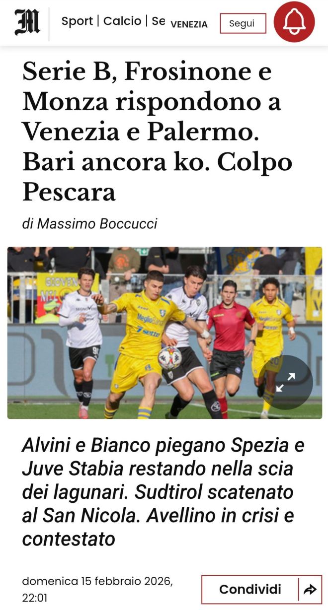 Frosinone e Monza hanno risposto al Venezia capolista e al Palermo che si è fatto sotto. La classifica nelle prime posizioni è rimasta, dunque, invariata. Nel blocco delle partite domenicali della 25ª giornata in Serie B, la squadra di Massimiliano Alvini ha superato 2-0 lo Spezia di Roberto Donadoni grazie ai gol Kvernadze e Ghedjemis. Assegnati e poi revocati al Var due rigori in favore dei liguri. In tribuna al Picco c’era anche l’interista Pio Esposito per tifare i suoi ex compagni. I brianzoli di Paolo Bianco ribaltano la Juve Stabia all’U-Power Stadium. La sblocca l’ex Mosti dopo un erroraccio di Thiam, poi Hernani pareggia i conti e Petagna, entrato dalla panchina, regala il successo ai padroni di casa lasciando gli uomini di Ignazio Abate con lo stop dopo 9 risultati utili consecutivi.