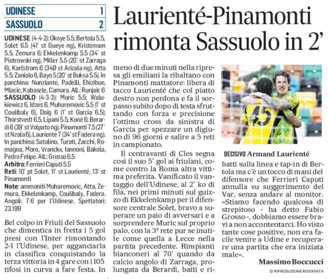 Bel colpo in Friuli del Sassuolo che dimentica in fretta i 5 gol presi con l’Inter rimontando 2-1 l’Udinese, per agganciarla in classifica conquistando la terza vittoria in 4 gare con i 105 tifosi in curva a fare festa. In meno di due minuti nella ripresa gli emiliani la ribaltano con Pinamonti mattatore: libera di tacco Laurienté che col piatto destro non perdona e fa il sorpasso subito dopo di testa sfruttando con forza e precisione l’ottimo cross da sinistra di Garcia per spezzare un digiuno di 96 giorni e salire a 5 reti in campionato.