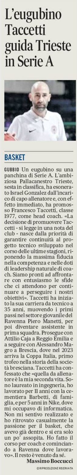 GUBBIO Un eugubino su una panchina di Serie A. L’ambiziosa Pallacanestro Trieste, sesta in classifica, ha esonerato Israel Gonzalez dall’incarico di capo allenatore e, con effetto immediato, ha promosso Francesco Taccetti, classe 1977, come head coach. «La decisione di promuovere Taccetti – si legge in una nota del club – nasce dalla priorità di garantire continuità al progetto tecnico sviluppato nel corso delle ultime stagioni, riponendo la massima fiducia nella competenza e nelle doti di leadership naturale di coach Taccetti e del nostro staff, che da tempo gode del rispetto e della stima dell’intero roster biancorosso. La nostra fiducia nella squadra resta incrollabile. Siamo pronti ad affrontare con entusiasmo le sfide che ci attendono per continuare a perseguire i nostri obiettivi. Coach Gonzalez ha contribuito a guidare la squadra verso vittorie prestigiose, la qualificazione in Coppa Italia e il raggiungimento del Round of 16 in Bcl, tappe fondamentali nel cammino di questa stagione. Nonostante ciò, la squadra non è riuscita a stabilire quel carattere e quell’identità di gioco necessari per esprimere il proprio pieno potenziale, ottenendo risultati al di sotto delle aspettative». Taccetti ha iniziato la sua carriera da tecnico a 35 anni, muovendo i primi passi nel settore giovanile del Ravenna Piero Manetti, per poi diventare assistente in prima squadra. Prosegue con Attilio Caja a Reggio Emilia e a seguire con Alessandro Magro a Brescia, dove nel 2023 arriva la Coppa Italia, primo trofeo nella storia della società bresciana. Taccetti ha confessato che «quella da allenatore è la mia seconda vita. Sono laureato in ingegneria, ho lavorato per 11 anni con la cementiera Barbetti, di famiglia, e per 5 anni in Nike, dove mi occupavo di informatica. Non mi sentivo realizzato e ho ritrovato casualmente la passione per il basket, che avevo già dentro e si era solo un po’ assopita. Ho fatto il corso per coach e cominciando a Ravenna dove lavoravo». Il resto è venuto da sé.