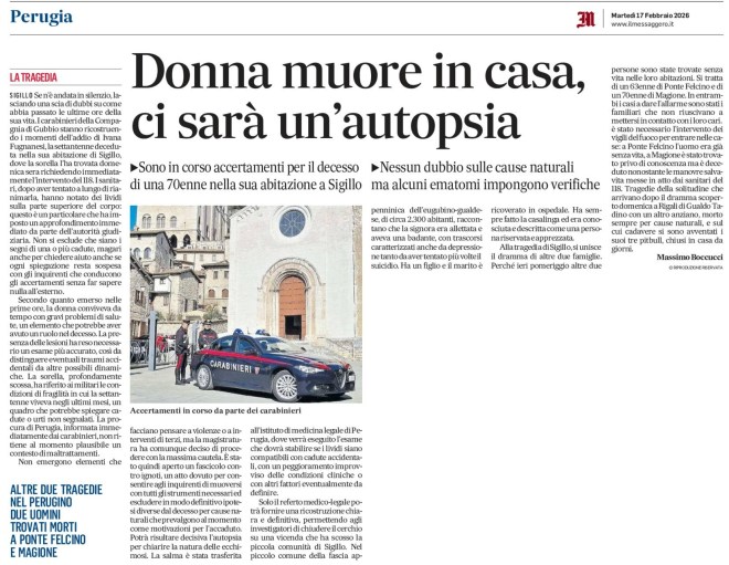 SIGILLO Se n’è andata in silenzio, lasciando una scia di dubbi su come abbia passato le ultime ore della sua vita. I carabinieri della Compagnia di Gubbio stanno ricostruendo i momenti dell’addio di Ivana Fugnanesi, la settantenne trovata senza vita nella sua abitazione di Sigillo, dove la sorella l’ha trovata domenica sera richiedendo immediatamente l’intervento del 118. I sanitari, dopo aver tentato a lungo di rianimarla, hanno notato dei lividi sulla parte superiore del corpo: questo è un particolare che ha imposto un approfondimento immediato da parte dell’autorità giudiziaria, che ha disposto l’autopsia.