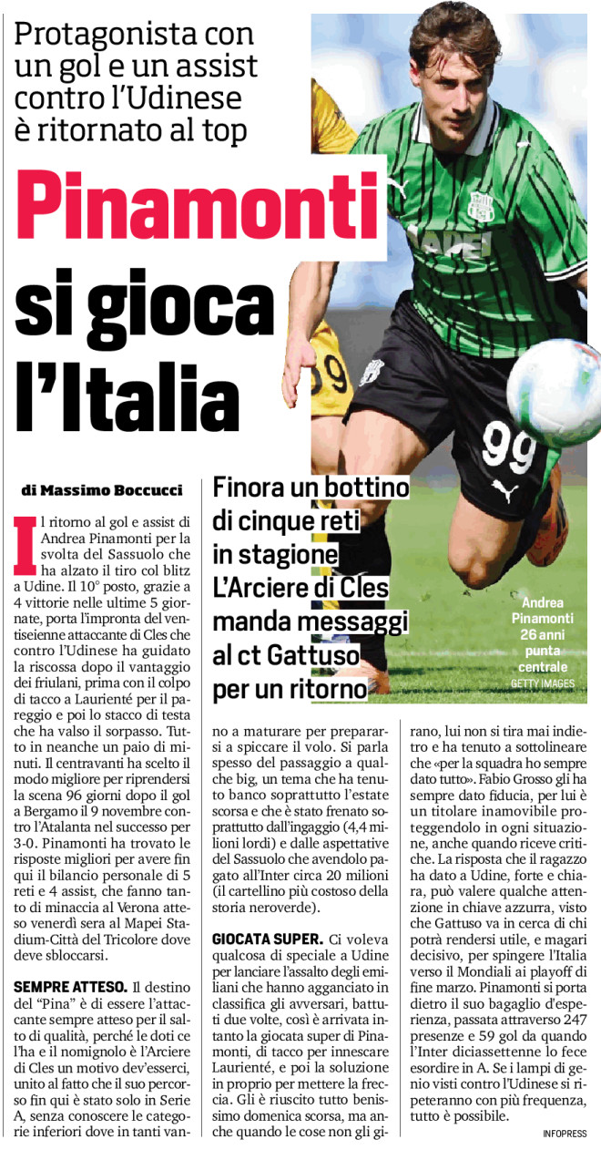 GIOCATA SUPER. Ci voleva qualcosa di speciale a Udine per lanciare l’assalto degli emiliani che hanno agganciato in classifica gli avversari, battuti due volte, così è arrivata intanto la giocata super di Pinamonti, di tacco per innescare Laurienté, e poi la soluzione in proprio per mettere la freccia. Gli è riuscito tutto benissimo domenica scorsa, ma anche quando le cose non gli girano, lui non si tira mai indietro e ha tenuto a sottolineare che «per la squadra ho sempre dato tutto». Fabio Grosso gli ha sempre dato fiducia, per lui è un titolare inamovibile proteggendolo in ogni situazione, anche quando riceve critiche. La risposta che il ragazzo ha dato a Udine, forte e chiara, può valere qualche attenzione in chiave azzurra, visto che Gattuso va in cerca di chi potrà rendersi utile, e magari decisivo, per spingere l’Italia verso il Mondiali ai playoff di fine marzo. Pinamonti si porta dietro il suo bagaglio d’esperienza, passata attraverso 247 presenze e 59 gol da quando l’Inter diciassettenne lo fece esordire in A. Se i lampi di genio visti contro l’Udinese si ripeteranno con più frequenza, tutto è possibile.