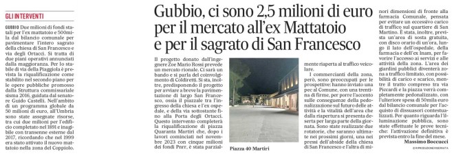 GUBBIO Due milioni di fondi statali per l’ex mattatoio e 500mila dal bilancio comunale per pavimentare l’intero sagrato della chiesa di San Francesco e via degli Ortacci. Si tratta di due piani operativi annunciati dalla maggioranza. Per lo stabile di via della Piaggiola è prevista la riqualificazione come stabilito nel secondo piano per le opere pubbliche promosso dalla Struttura commissariale sisma 2016, guidata dal senatore Guido Castelli. Nell’ambito di un programma globale da 50 milioni di euro, all’Umbria sono state assegnate risorse, tra cui due milioni per l’edificio completato nel 1891 e inagibile con transenne esterne dal 2017, ricordando che nel 1999 era stato attivato il nuovo mattatoio nella zona del Coppiolo. Il progetto donato dall’ingegnere Zoe Mario Rossi prevede un mercato rionale. Ci sarà un bando e si parla del coinvolgimento di Coldiretti. Si sta, inoltre, predisponendo il progetto per avviare a breve la pavimentazione di largo San Francesco, ossia il piazzale tra l’ingresso della chiesa e l’ex ospedale, e della via sottostante fino alla Porta degli Ortacci. Questo intervento completerà la riqualificazione di piazza Quaranta Martiri che, dopo i lavori cominciati nel novembre 2023 con cinque milioni dei fondi Pnrr, è stata parzialmente riaperta al traffico veicolare. I commercianti della zona, però, sono preoccupati per le prospettive: hanno inviato una pec al Comune, con una trentina di firme, per porre l’accento sulle conseguenze della pedonalizzazione sul futuro delle attività e la vitalità dell’area che dalla riapertura si presenta deserta per larga parte della giornata. Sono state realizzate due rotatorie, che saranno ultimate nei prossimi giorni, una nei pressi dell’abside della chiesa di San Francesco e l’altra di minori dimensioni di fronte alla farmacia Comunale, pensata per evitare un eccessivo carico di traffico sul quartiere di San Martino. È stata, inoltre, prevista un’area di sosta gratuita, con disco orario di di un’ora, lungo il lato dell’ospedale, della farmacia e dell’ex Inam, per favorire l’accesso ai servizi e alle attività della zona. L’area dei giardini pubblici diventerà zona a traffico limitato (Ztl), con possibilità di carico e scarico per le attività commerciali, mentre il tratto compreso tra via Piccardi e la piazza verrà completamente pedonalizzato, con l’ulteriore spesa di 50mila euro dal bilancio comunale per l’acquisto di dissuasori contestualizzati. Per quanto riguarda l’illuminazione pubblica, sono state effettuate le prove tecniche: l’attivazione definitiva è prevista entro la fine del mese.