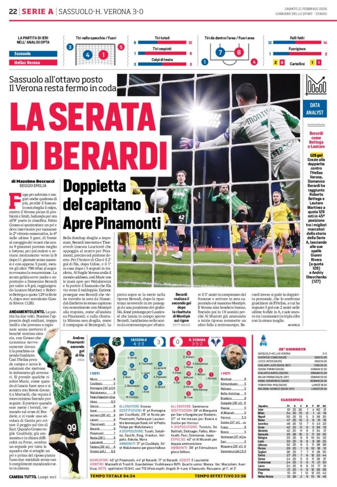 Fuga per salvezza e magari anche qualcosa di più, perché il Sassuolo non sbaglia il colpo, contro il Verona pieno di problemi e limiti, balzando per ora all’8° posto in classifica. Fabio Grosso si spazientisce un po’ e deve intervenire per incassare la 2ª vittoria consecutiva, la 4ª nelle ultime 5 gare, di fronte al coraggio dei veneti che senza 9 giocatori partono meglio e lottano, per poi cedere e avviarsi mestamente verso la B dopo 11 giornate senza successi e con appena 3 punti, mentre gli oltre 700 tifosi al seguito evocano la resurrezione. La serata gelida serve anche e soprattutto a Domenico Berardi per salire a 8 gol, raggiungendo Lautaro Martínez e Roberto Bettega a quota 129 in Serie A, dopo aver scavalcato Gianni Rivera (128).