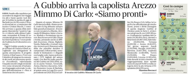 Quanto al campo, Mimmo Di Carlo lancia la sfida: «Siamo pronti, contro le big abbiamo sempre fatto grandi prestazioni». Il tecnico non recupera La Mantia, ritrovando Di Massimo, Saber e Carraro. Modulo e formazione top secret. Bucchi non avrà Gilli, Chiosa e Ionita, pensando anche ai diffidati (Guccione, Chiosa, Righetti, Varela, Pattarello e Cortesi) visto che riceverà poi il Ravenna nella sfida che potrebbe decidere il campionato. I tifosi aretini, nonostante le limitazioni e i disguidi con lunghe code, hanno polverizzato i 1.175 biglietti del settore ospiti. Con Bucchi (sulla panchina del Gubbio nel 2013-2014), sono ex anche Venturi, Tavernelli, Arena, Chierico e Iaccarino. Arbitra Domenico Leone di Barletta, al quinto anno in Lega Pro con il precedente nel 2021-2022 in Gubbio-Vis Pesaro (3-0). Infine, la Lega Pro ha ufficializzato gli emolumenti, premi e diritti immagine di questa stagione: Gubbio al 35° posto in Serie C, al 10° nel girone B, con 2.065.561 euro. Graduatoria è guidata dal Catania (14.210.854 euro), davanti a Benevento (10.867.445), Salernitana (10.692.159), Ternana (8.695.511) e Arezzo (8.111.057). Nel girone seguono Ascoli (5.552.998), Perugia (4.603.902), Ravenna (4.657.395), Guidonia Montecelio (3.410.989), Torres (3.159.661), Vis Pesaro (2.693.084), Livorno (2.595.452), tutte davanti al club rossoblù, nel raggruppamento dove spende meno il Carpi (879.087) e nella categoria dove la più virtuosa è l’Ospitaletto (664.055 euro).