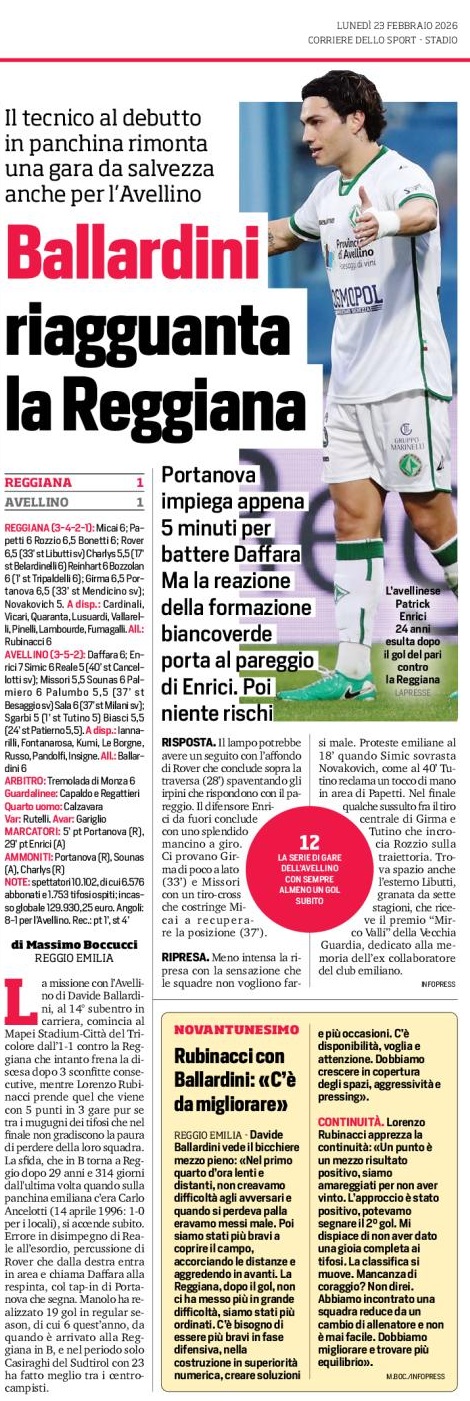 La missione con l’Avelli no di Davide Ballardini, al 14° subentro in carriera, comincia al Mapei Stadium-Città del Tricolore dall’1-1 contro la Reggiana che intanto frena la discesa dopo 3 sconfitte consecutive, mentre Lorenzo Rubinacci prende quel che viene con 5 punti in 3 gare pur se tra i mugugni dei tifosi che nel finale non gradiscono la paura di perdere della loro squadra. La sfida, che in B torna a Reggio dopo 29 anni e 314 giorni dall’ultima volta quando sulla panchina emiliana c’era Carlo Ancelotti (14 aprile 1996: 1-0 per i locali), si accende subito. Errore in disimpegno di Reale all’esordio, percussione di Rover che dalla destra entra in area e chiama Daffara alla respinta, col tap-in di Portanova che segna. Manolo ha realizzato 19 gol in regular season, di cui 6 quest’anno, da quando è arrivato alla Reggiana in B, e nel periodo solo Casiraghi del Sudtirol con 23 ha fatto meglio tra i centrocampisti.