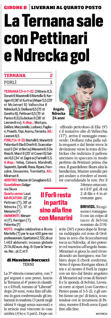 BRIVIDI. Reagiscono i romagnoli con un colpo di tacco di Selvini sventato da D’Alterio (30’) e poco dopo la Ternana raddoppia col cross di Orellana in area che Scaccabarozzi tocca su Ndrecka, al tiro potente col mancino all’angolo basso. Miramari si gioca la card rivendicando un fuorigioco, ma l’arbitro dopo il check conferma. Verso il riposo Kerrigan sfiora il tris e al rientro il Forlì la riapre con un tiro dal limite angolato di Menarini sul cross di Farinelli e la sponda di Selvini. Liverani corre ai ripari (con Garetto e Panico passa al 3-5-2), e gli umbri fanno un po’ di fatica, scuotendosi con le incursioni di Panico, mentre il Forlì cerca il pari fino alla fine.