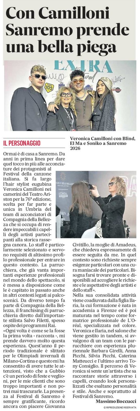 Ormai è di casa a Sanremo. Da anni in prima linea per dare quel tocco in più alle acconciature dei protagonisti al Festival della canzone italiana. Si fa largo l’hair stylist eugubina Veronica Camilloni nei camerini del Teatro Ariston per la 76ª edizione, scelta per far parte e unica in Umbria del team di acconciatori di Compagnia della Bellezza che si occupa di rendere impeccabili i capelli degli artisti partecipanti alla storica rassegna canora. Lo staff è particolarmente selezionato e servono requisiti di altissimo profilo professionale per entrare in questo contesto. La parrucchiera, che già vanta importanti esperienze professionali nel mondo dello spettacolo, si è messa a disposizione come le è capitato in passato anche in altri contesti legati ai palcoscenici. Da diverso tempo fa parte di Compagnia della Bellezza, il franchising di parrucchieria diretto dall’importante stilista Salvo Filetti, spesso ospite dei programmi Rai.