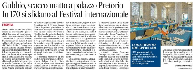 GUBBIO Prima di fare una mossa, magari da scacco matto, gli scacchisti alzeranno gli occhi perdendosi tra le volte maestose della sala Trecentesca di palazzo Pretorio trasformata in un campo di gara del Festival internazionale di scacchi “Città di Gubbio”. Da oggi a domenica si danno battaglia oltre 170 appassionati di un gioco fatto di intelligenza e arguzia, in un contesto storico-architettonico davvero speciale. Si tratta della quarta edizione di questo appuntamento che richiama gli specialisti di questo gioco a livello nazionale e internazionale. Il torneo è organizzato da Giuseppe Zangla, scacchista siciliano ed esperto organizzatore, in collaborazione con il Gruppo Scacco Matto Eugubino, presieduto da Francesco Zaccagni, con il contributo e il patrocinio del Comune di Gubbio. Zangla ha individuato in Gubbio il luogo ideale per ospitare manifestazioni scacchistiche di rilievo, per la bellezza della città, per la posizione geografica centrale e soprattutto per la splendida e ampia sala da gioco della sala Trecentesca, che si conferma una cornice di grande fascino per eventi di questo livello.