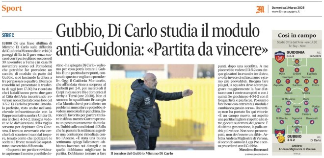 «In queste tre partite ravvicinate capiremo il nostro possibile destino – ha spiegato Di Carlo -, vedremo per cosa potrà lottare il Gubbio. È una partita da tre punti, conta solo questo e vogliamo prenderli». Oggi il Guidonia Montecelio, che all’andata vinse a sorpresa al Barbetti per 2-0, poi mercoledì il Carpi in casa (ore 18) e domenica il derby a Terni (ore 20.30). Non ci saranno lo squalificato Bruscagin e La Mantia che si porta dietro un problema muscolare e potrebbe rivedersi mercoledì in panchina. Baroncelli favorito per partire titolare in difesa, mentre Carraro prenota un posto nuovamente da titolare. Dubbi sulle condizioni di Zallu che ha passato la settimana a gestire una contusione rimediata contro l’Arezzo. «È stata una buona settimana – spiega l’allenatore -, abbiamo lavorato sui dettagli e su quello che dobbiamo migliorare nell’arco della gara. Il Guidonia è una squadra tecnica e rapida, dovremo essere bravi a non concedergli spazi. Faranno di tutto per tornare alla vittoria, così come noi dopo una sconfitta che non meritavamo. Dobbiamo tornare a fare punti, dopo una sconfitta la miglior medicina è fare risultato. Il 3-5-2 è un modulo che a me piacerebbe vedere con cinque giocatori in avanti e tre dietro, a volte ci schiacciamo e siamo più prevedibili. Abbiamo fatto delle buone prove ma bisogna fare più gol, la squadra deve accompagnare maggiormente la fase d’attacco con i centrocampisti o con i quinti. Se giochiamo 4-3-1-2 con il trequartista è più facile. Possiamo fare bene con entrambi i moduli, possiamo cambiare a gara in corso». I risultati adesso pesano di più: «Nel girone di ritorno tutte le squadre hanno un obiettivo e vogliono fare punti, così come noi. La squadra sta bene, ho fiducia, i ragazzi stanno crescendo, siamo più squadra rispetto all’inizio. Tutti danno il massimo, è un segnale importante. Ogni partita ha una storia a sé, non firmo per lo 0-0, abbiamo le qualità per fare male al Guidonia con tutto il rispetto che è dovuto». Il sintetico non ha portato fin qui vittorie: «È un campo nuovo, mi aspetto una partita migliore rispetto alle altre giocate su terreni del genere. È di ultima generazione, la palla andrà più veloce. Servono gamba e tecnica. Non sono preoccupato, sicuramente non deve essere un alibi». Arbitra Andrea Migliorini di Verona, al secondo anno in Lega Pro e senza precedenti con il Gubbio.
