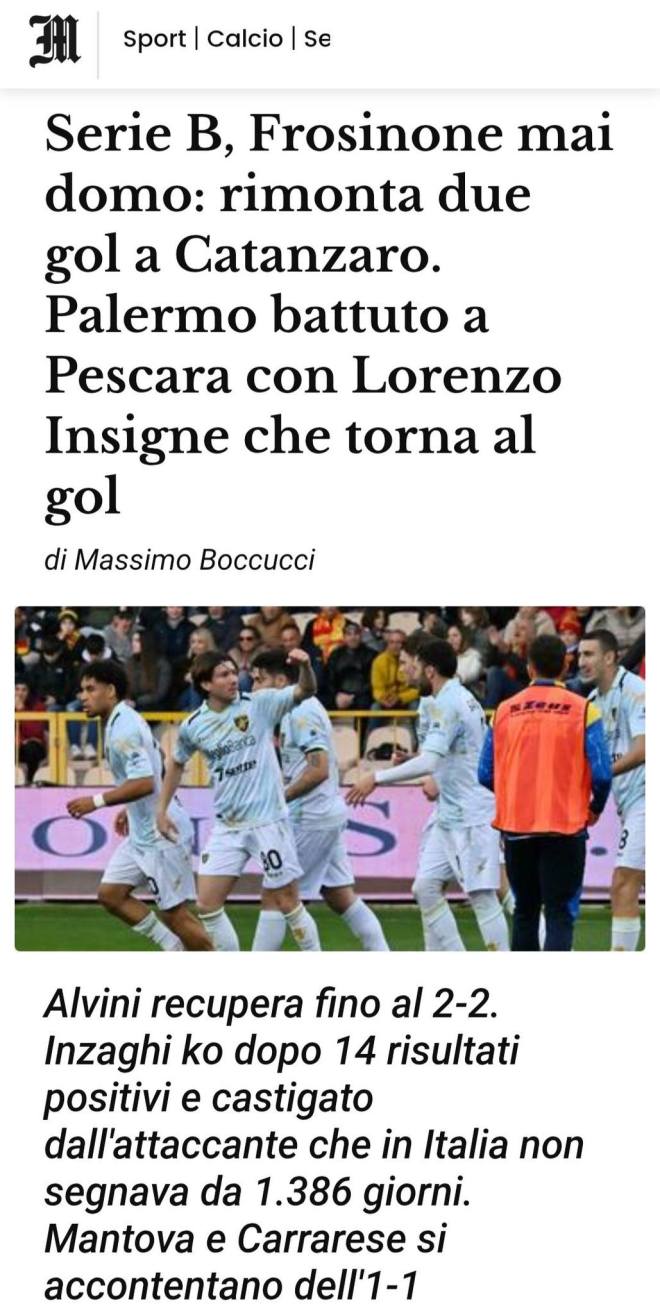 La rimonta del Frosinone a Catanzaro fino al 2-2 e la sconfitta del Palermo a Pescara dopo 14 risultati utili consecutivi hanno caratterizzato la domenica della 27ª giornata in Serie B, che porta al turno infrasettimanale in programma tra martedì 3 e mercoledì 4 marzo. Massimiliano Alvini non si perde d’animo al Ceravolo recuperando il doppio svantaggio contro i calabresi di Alberto Aquilani che venivano da 4 vittorie filate. Frosimini, al primo gol in B, e Liberali ex Milan fanno scattare il Catanzaro, poi Cicchella e Fiori ristabiliscono la parità.