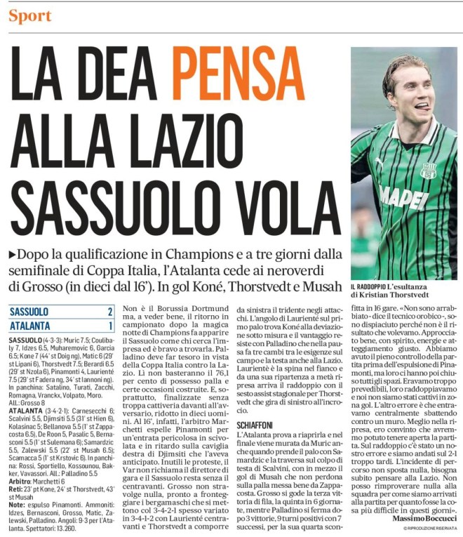 Non è il Borussia Dortmund ma, a veder bene, il ritorno in campionato dopo la magica notte di Champions fa apparire il Sassuolo come chi cerca l’impresa ed è bravo a trovarla. Palladino deve far tesoro in vista della Coppa Italia contro la Lazio, dove non basteranno il 76,1 per cento di possesso palla e certe occasioni costruite e soprattutto finalizzate senza troppa cattiveria davanti all’avversario ridotto in dieci uomini perché al 16’ l’arbitro Marchetti espelle Pinamonti per un’entrata pericolosa in scivolata e in ritardo sulla caviglia destra di Djimsiti che l’aveva anticipato. Inutili le proteste, il Var non richiama il direttore di gara e il Sassuolo resta senza il centravanti. Grosso non stravolge nulla, pronto a fronteggiare i bergamaschi che si mettono col 3-4-2-1 spesso variato in 3-4-1-2 con Laurienté centravanti e Thorstvedt a comporre da sinistra il tridente negli attacchi. L’angolo di Laurienté sul primo palo trova Koné alla deviazione sotto misura e il vantaggio resiste con Palladino che nella pausa fa tre cambi tra le esigenze sul campo e la testa anche alla Lazio. Laurienté è la spina nel fianco e da una sua ripartenza a metà ripresa arriva il raddoppio con il sesto assist stagionale per Thorstvedt che gira di sinistro all’incrocio. Fadera finisce in ospedale per accertamenti alla testa dopo aver lasciato il campo stordito nella sua partita durata cinque minuti.
