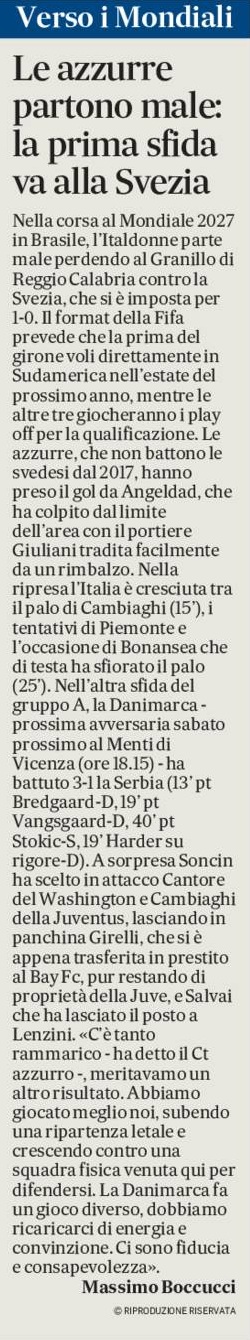 Nella corsa al Mondiale 2027 in Brasile, l’Italdonne parte male perdendo al Granillo di Reggio Calabria contro la Svezia, che si è imposta per 1-0. Il format della Fifa prevede che la prima del girone voli direttamente in Sudamerica nell’estate del prossimo anno, mentre le altre tre giocheranno i play off per la qualificazione. Le azzurre, che non battono le svedesi dal 2017, hanno preso il gol da Angeldad, che ha colpito dal limite dell’area con il portiere Giuliani tradita facilmente da un rimbalzo. Nella ripresa l’Italia è cresciuta tra il palo di Cambiaghi (15’), i tentativi di Piemonte e l’occasione di Bonansea che di testa ha sfiorato il palo (25’). Nell’altra sfida del gruppo A, la Danimarca – prossima avversaria sabato prossimo al Menti di Vicenza (ore 18.15) – ha battuto 3-1 la Serbia (13’ pt Bredgaard-D, 19’ pt Vangsgaard-D, 40’ pt Stokic-S, 19’ st Harder su rigore-D). A sorpresa Soncin ha scelto in attacco Cantore del Washington e Cambiaghi della Juventus, lasciando in panchina Girelli, che si è appena trasferita in prestito al Bay Fc, pur restando di proprietà della Juve, e Salvai che ha lasciato il posto a Lenzini. «C’è tanto rammarico – ha detto il Ct azzurro -, meritavamo un altro risultato. Abbiamo giocato meglio noi, subendo una ripartenza letale e crescendo contro una squadra fisica venuta qui per difendersi. La Danimarca fa un gioco diverso, dobbiamo ricaricarci di energia e convinzione. Ci sono fiducia e consapevolezza».