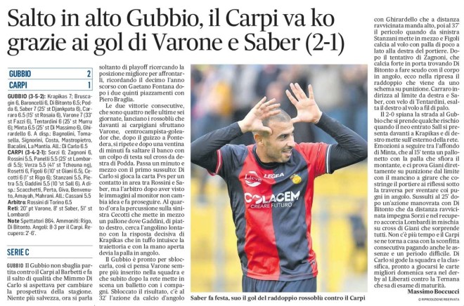 Il 2-0 spiana la strada al Gubbio che si prende qualche rischio quando il neo entrato Sall si presenta davanti a Krapikas e di destro mette sull’esterno della rete. Emozioni a seguire tra l’affondo di Minta, che al 15’ tenta un pallonetto con la palla che sfiora il montante, e ci prova Giani direttamente su punizione dal limite con il mancino a girare che costringe il portiere ai riflessi sotto la traversa per sventare coi pugni in angolo. Sussulti al 25′ dopo un’azione manovrata con Di Bitonto che da distanza ravvicinata impegna Sorzi e nel recupero accorcia Lombardi in mischia su cross di Giani che sorprende tutti. Non c’è più tempo e il Carpi se ne torna a casa con la sconfitta consecutiva pagando anche le assenze e un periodo difficile. Di Carlo si gode la squadra e la classifica, pronto a giocarsi le carte migliori domenica sera nel derby al Liberati contro la Ternana che sa di esame di maturità.