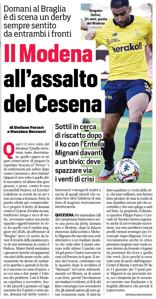 Qual è il vero volto del Modena? Quello irriverente, tosto, determinato, quello capace in tre gare consecutive di piegare la capolista Venezia al “Penzo” e di confermarsi poi subito dopo contro Carrarese e Juve Stabia? Oppure il vero volto è quello delle successive ed ultime due gare giocate, e perse, contro le non irresistibili Padova ed Entella? L’altalena va avanti da un po’ e non accenna a fermarsi. Forse la partita ideale per comprenderlo è proprio il derby di domani contro il Cesena. Rivalità accesa, tradizione lunga e ricca di storie, avversario ostico ma anche squadra oggettivamente in crisi, fra quelle con il ruolino peggiore nel 2026, da affrontare al “Braglia” dove c’è anche da lavare il ricordo della pessima prova di una settimana fa contro il Padova. Mister Sottil sostituisce i giocatori stanchi ed appannati con altri dello stesso ruolo, solo raramente ha deciso di cambiare lo spartito e quando lo ha fatto è successo in corso d’opera, e se con una o due punte è l’ultimo dei problemi. Così il Modena capolista a novembre, fuori dai playoff a gennaio ed oggi ancorato fra il quinto e sesto posto, domani nel derby contro i bianconeri romagnoli andrà a caccia di quegli stimoli che vadano ben oltre l’altalena di una fetta di stagione storicamente interlocutoria.
