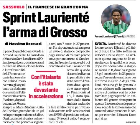 Il pericolo pubblico neroverde è Armand Laurienté. La Lazio lo sa e Maurizio Sarri lunedì sera all’Olimpico qualcosa dovrà inventarsi per frenare il Sassuolo con l’estro e l’irrefrenabilità del 27enne attaccante francese che con Fabio Grosso ha rotto gli argini, tanto da sfoderare due assist nell’ultima vittoria contro l’Atalanta, dopo altrettanti col Verona sempre al Mapei Stadium-Città del Tricolore, preceduti da un gol nella partita precedente a Udine. Oggi Laurienté si carica nel percorso che l’ha portato a segnare 4 reti, con 7 assist, in 27 presenze. Sta rispondendo sul campo a un avvio di stagione complicato dagli intrecci di mercato perché stava per andarsene al Sunderland in Premier League ed è poi rientrato alla base. Lo sanno tutti ormai che quando si accende diventa imprendibile e si è visto contro l’Atalanta dove, quando è stato espulso Pinamonti al 16’, è stato spostato dalla fascia sinistra andando a fare il falso nueve per rivelarsi devastante nelle accelerazioni con il 90% di precisione nei passaggi, 34 tocchi palla, 4 recuperi e 5 duelli.