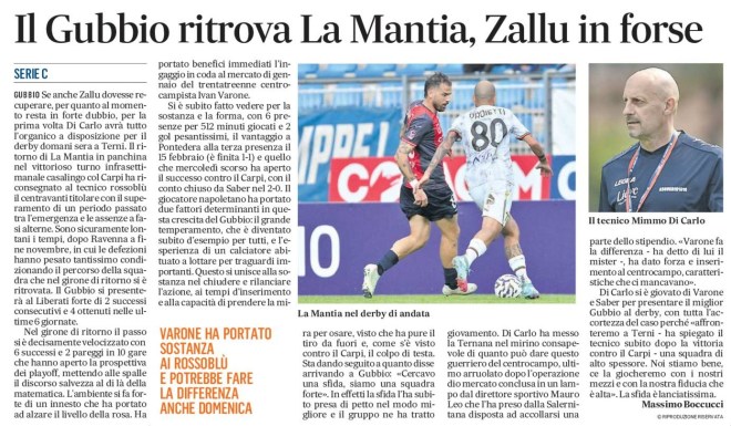 Di Carlo si è giovato di Varone e Saber per presentare il miglior Gubbio al derby, con tutta l’accortezza del caso perché «affronteremo a Terni – ha spiegato il tecnico subito dopo la vittoria contro il Carpi – una squadra di alto spessore. Noi stiamo bene, ce la giocheremo con i nostri mezzi e con la nostra fiducia che è alta». La sfida è lanciatissima.