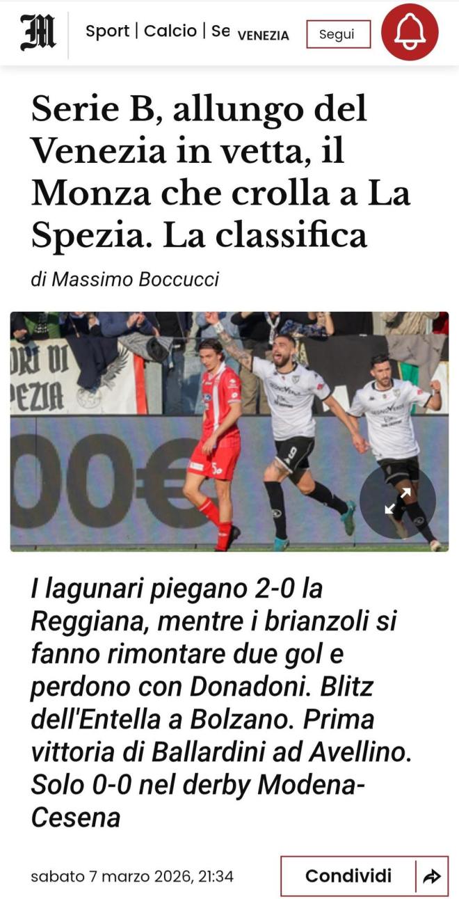 Stacca tutti il Venezia che nella 29ª giornata in Serie B batte al Penzo la Reggiana per 2-0 e si lascia dietro il Monza battuto 4-2 a La Spezia nonostante il doppio vantaggio dopo 16 minuti. I lagunari, contro gli emiliani rimaneggiati, la sbloccano al quarto d’ora quando Haps riceve palla da Doumbia, avanza e dal limite dell’area supera Micai con un angolato, aggiungendo nel 1° tempo anche 2 pali colpiti da Adorante e Kike Perez. Il raddoppio nella ripresa al 26’ con Doumbia che da pochi passi dalla porta non perdona dopo una parata di Micai sul tiro di Yeboah. A seguire altri due pali colpiti dai padroni di casa con Doumbia e Sagrado. Per Lorenzo Rubinacci è arrivato il 2° ko consecutivo dopo i precedenti 8 punti in 4 gare.