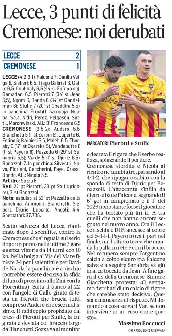 Cremonese stordita e Nicola al rientro ne cambia tre, passando al 4-4-2, che ripagano subito con la sponda di testa di Djuric per Bonazzoli. L’attaccante s’infila da dietro e batte Falcone, segnando il 6° gol in campionato e il 1° del 2026 nonostante fosse il giocatore che ha tentato più tiri in A tra quelli che non hanno ancora segnato nel nuovo anno. Ora il Lecce rischia e Di Francesco si copre col 5-3-1-1. Payero trova il pari nel finale, ma l’ultimo tocco che manda la palla in rete è con il braccio. Nel recupero sempre l’argentino calcia a colpo sicuro ma Falcone salva e a seguire Sanabria va giù in area toccato da Jean. A fine gara il ds della Cremonese, Simone Giacchetta, protesta: «Ci sentiamo derubati di un calcio di rigore che sarebbe stato decisivo. Questa è mancanza di rispetto. Mi domando a cosa serva il Var, se non interviene in un caso come questo».