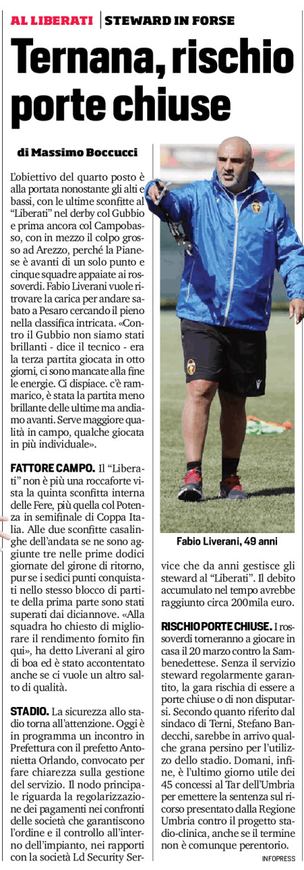 RISCHIO PORTE CHIUSE. I rossoverdi torneranno a giocare in casa il 20 marzo contro la Sambenedettese. Senza il servizio steward regolarmente garantito, la gara rischia di essere a porte chiuse o di non disputarsi. Secondo quanto riferito dal sindaco di Terni, Stefano Bandecchi, sarebbe in arrivo qualche grana persino per l’utilizzo dello stadio. Domani, infine, è l’ultimo giorno utile dei 45 concessi al Tar dell’Umbria per emettere la sentenza sul ricorso presentato dalla Regione Umbria contro il progetto stadio-clinica, anche se il termine non è comunque perentorio.