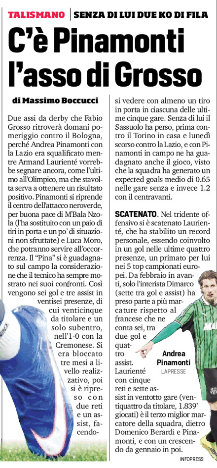 Due assi da derby che Fabio Grosso ritroverà domani pomeriggio contro il Bologna, perché Andrea Pinamonti con la Lazio era squalificato mentre Armand Laurienté vorrebbe segnare ancora, come l’ultimo all’Olimpico, ma che stavolta serva a ottenere un risultato positivo. Pinamonti si riprende il centro dell’attacco neroverde, per buona pace di M’Bala Nzola (l’ha sostituito con un paio di tiri in porta e un po’ di situazioni non sfruttate) e Luca Moro, che potranno servire all’occorrenza. Il “Pina” si è guadagnato sul campo la considerazione che il tecnico ha sempre mostrato nei suoi confronti. Così vengono sei gol e tre assist in ventisei presenze, di cui venticinque da titolare e un solo subentro, nell’1-0 con la Cremonese. Si era bloccato tre mesi a livello realizzativo, poi si è ripreso con due reti e un assist, facendosi vedere con almeno un tiro in porta in ciascuna delle ultime cinque gare. Senza di lui il Sassuolo ha perso, prima contro il Torino in casa e lunedì scorso contro la Lazio, e con Pinamonti in campo ne ha guadagnato anche il gioco, visto che la squadra ha generato un expected goals medio di 0.65 nelle gare senza e invece 1.2 con il centravanti.