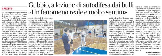 GUBBIO Un percorso per la difesa personale destinato alle classi dell’istituto superiore Cassata-Gattapone nel plesso con annessa palestra di via del Bottagnone. Il progetto è rivolto a più classi e in particolare a due classi, le prime del biennio comune tecnologico Non semplici lezione di sport ma un’esperienza di profonda consapevolezza guidata dal maestro Roberto Carlotti. Coinvolti gli studenti per imparare a gestire le emozioni e prevenire i fenomeni di bullismo e in generale le situazioni critiche con lucidità. Ci sono anche altri percorsi attivati di arti marziali con i principi dell’autodifesa che chiama in causa i comportamenti nelle occasioni di potenziale pericolo, dalle possibilità di fuga alle tecniche difensive, e per esternare le negatività confidando gli episodi di cui un giovane può ritrovarsi vittima.