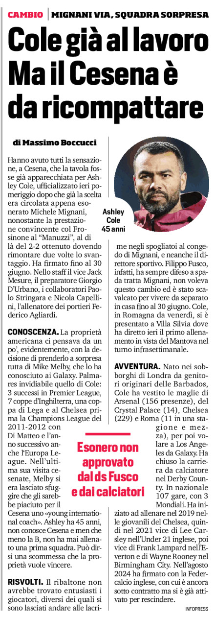 Hanno avuto tutti la sensazione, a Cesena, che la tavola fosse già apparecchiata per Ashley Cole, ufficializzato ieri pomeriggio dopo che già la scelta era circolata appena esonerato Michele Mignani, nonostante la prestazione convincente col Frosinone al “Manuzzi”, al di là del 2-2 ottenuto dovendo rimontare due volte lo svantaggio. Ha firmato fino al 30 giugno. Nello staff il vice Jack Mesure, il preparatore Giorgio D’Urbano, i collaboratori Paolo Stringara e Nicola Capellini, l’allenatore dei portieri Federico Agliardi.