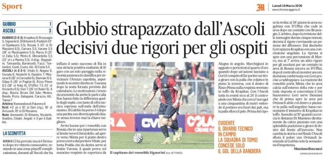 GUBBIO Ci ha provato ma si è fermato dopo tre vittorie consecutive, restando in una zona playoff complicatissima, davanti all’Ascoli che ha infilato il sesto successo di fila in una striscia positiva esaltante di 10 gare con un solo pareggio nella rimonta pazzesca in classifica per avvicinare l’Arezzo capolista, aspettando lo scontro diretto in Toscana dopo la sosta forzata prevista dal calendario. Le motivazioni c’erano sicuramente da ambo le parti e alla fine hanno fatto la differenza quelle degli ospiti, con tanto di cifra tecnica espressa sull’onda dell’entusiasmo. Il Gubbio ha perso 3-1 dopo una partita con diversi episodi chiave senza trovare mai la chiave migliore.