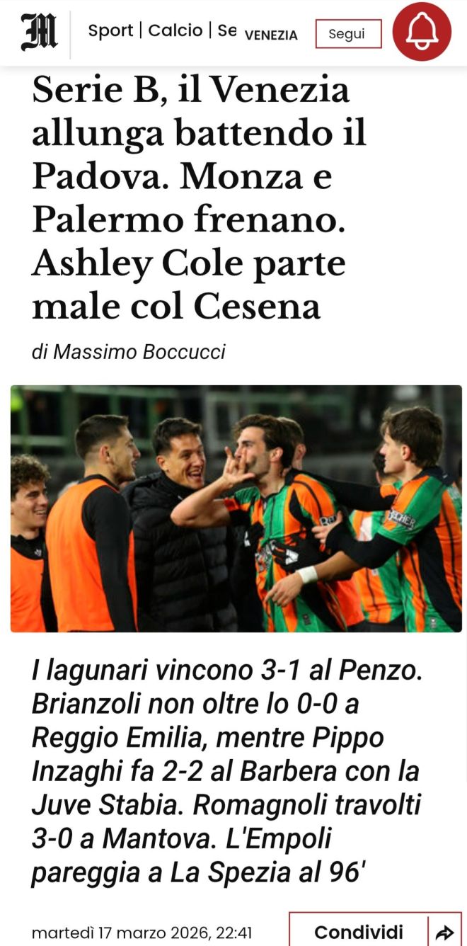 Guadagna terreno il Venezia capolista che batte 3-1 nella 31ª giornata in Serie B, allungando su Monza e Palermo fermate entrambe sul pareggio. I lagunari contro il Padova impiegano 40 minuti nel vento gelido dello stadio Penzo, poi tra la fine del primo e l’inizio della ripresa si portano a casa la partita, aggiungendo la ciliegina del 3-0 di Perez a cui replica Capelli all’82’. In apertura della 2ª frazione, dopo una trentina secondi, il portiere Sorrentino si rende protagonista di un grave errore non intervenendo con decisione su una palla in area e consentendo con un rimpallo tragicomico il raddoppio di Doumbia. A quel punto la gara è finita.