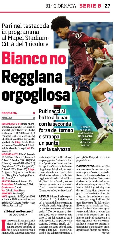 Incerottata la Reggiana, ma piena di vita e di volontà con cui dopo 3 sconfitte di fila e 10 gol subiti ferma il Monza, che con poca cattiveria resta inchiodato sullo 0-0 con un pareggio tra 5 vittorie e il ko a La Spezia allontanandosi dalla capolista Venezia. Rubinacci aggiunge Tripaldelli, fermato da un risentimento muscolare all’adduttore destro, nella lista degli assenti con Paz, Vicari, Rozzio, Bozzolan e Gondo, mentre la curva granata tace un quarto d’ora con lo striscione di protesta “Questo è quello che vi meritate”.