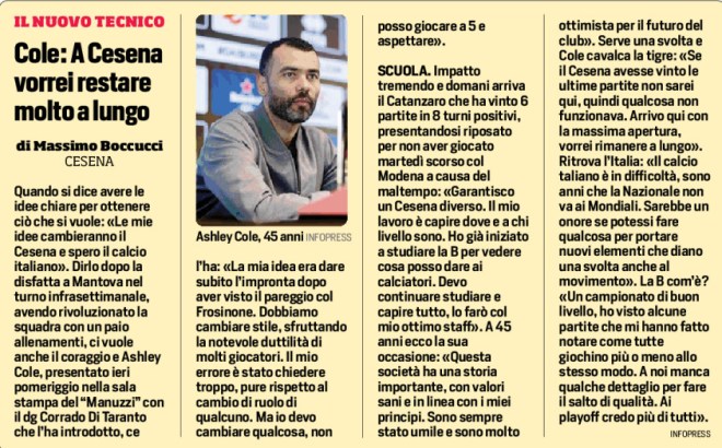 Quando si dice avere le idee chiare per ottenere ciò che si vuole: «Le mie idee cambieranno il Cesena e spero il calcio italiano». Dirlo dopo la disfatta a Mantova nel turno infrasettimanale, avendo rivoluzionato la squadra con un paio allenamenti, ci vuole anche il coraggio e Ashley Cole, presentato ieri pomeriggio nella sala stampa del “Manuzzi” con il dg Corrado Di Taranto che l’ha introdotto, ce l’ha: «La mia idea era dare subito l’impronta dopo aver visto il pareggio col Frosinone. Dobbiamo cambiare stile, sfruttando la notevole duttilità di molti giocatori. Il mio errore è stato chiedere troppo, pure rispetto al cambio di ruolo di qualcuno. Ma io devo cambiare qualcosa, non posso giocare a 5 e aspettare».