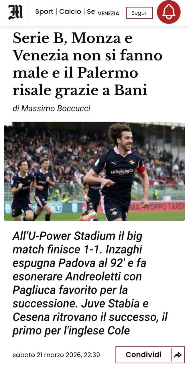 Il Palermo ha vinto all’Euganeo con il Padova che ha annunciato il silenzio e dopo la 4ª sconfitta di fila ha esonerato il tecnico Matteo Andreoletti, con favorito per la successione Guido Pagliuca, che ha cominciato la stagione a Empoli. I rosanero di Pippo Inzaghi restano in 10 uomini al 25’ per il rosso rimediato da Rui Modesto, alla prima da titolare. Gli ospiti creano poco, i padroni di casa chiudono gli spazi e al 92’, dopo una mischia in area, ci pensa il capitano Bani a risolvere. La Juve Stabia torna a vincere dopo un mese e mezzo: sorride Ignazio Abate per il 3-1 sullo Spezia con le reti di Leone su rigore, Pierobon con una prodezza e Okoro davanti ai liguri illusi dal vantaggio iniziale di Aurelio.