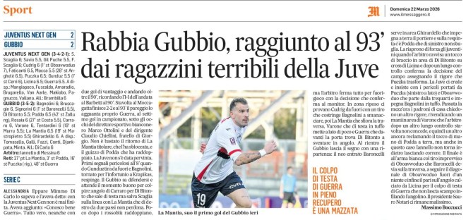 ALESSANDRIA Eppure Mimmo Di Carlo lo sapeva e l’aveva detto: con la Juventus Next Gen non è mai finita. Aveva aggiunto: «Conosco bene Guerra». Tutto vero, neanche con due gol di vantaggio e andando oltre il 90’, ricordando l’1-1 dell’andata al Barbetti al 90’. Stavolta al Moccagatta finisce 2-2 e al 93’ il pareggio lo agguanta proprio Guerra, al settimo gol in campionato (più 6 assist), sotto gli occhi del direttore sportivo bianconero Marco Ottolini e del dirigente Claudio Chiellini, fratello di Giorgio. Non è bastato il ritorno di La Mantia titolare, che l’ha sbloccata, e il guizzo di Podda che ha raddoppiato. La Juve non s’è data per vinta. Primi segnali pericolosi all’8’ quando Gunduz tira da fuori e Bagnolini, tornato per l’infortunio a Krapikas, respinge. Il Gubbio sa difendersi e attende il momento buono per colpire: angolo di Carraro per Di Bitonto che sale di testa ma salva Scaglia sulla linea con La Mantia che di destro da due passi non perdona. Poco dopo i rossoblù raddoppiano, ma l’arbitro ferma tutto per fuorigioco con la decisione che conferma al monitor. In zona riposo ci provano Cudrig da fuori con un tiro che costringe Bagnolini a smanacciare, poi La Mantia che sfiora la traversa, Varone che di testa in tuffo mette a lato di poco e Guerra che davanti la porta trova Di Bitonto a sventare in angolo. Al rientro il Gubbio lascia il segno con una ripartenza: il neo entrato Baroncelli serve in area Ghirardello che impegna a terra il portiere e sulla respinta c’è Podda che di sinistro non sbaglia. La riaprono di forza gli juventini quando l’arbitro ravvisa un tocco di braccio in area di Di Bitonto su cross di Licina e dopo un lungo controllo conferma la decisione del campo assegnando il rigore che Puczka trasforma di sinistro. La Juve ci crede e insiste con i pericoli portati da Puczka (sinistro e palla a lato) e Oboavwoduo che parte dalla trequarti e impegna severamente Bagnolini in tuffo. Passata la mezz’ora i padroni di casa chiedono un altro rigore, rivendicando un mani in area di Varone che l’arbitro dopo un altro lungo controllo stavolta non concede, e quindi un altro ancora reclamando il tocco di mano di Podda a terra, ma anche in questo caso Iannello non torna indietro lasciando correre. Il finale è all’arma bianca col tiro improvviso di Oboavwoduo che Baroncelli devia sulla traversa, a seguire il diagonale di Oboavwoduo fuori d’un niente e infine il pareggio sull’angolo calciato in area da Licina per il colpo di testa di Guerra che non lascia scampo infilando l’angolino. Il presidente Sauro Notari ci rimane malissimo.