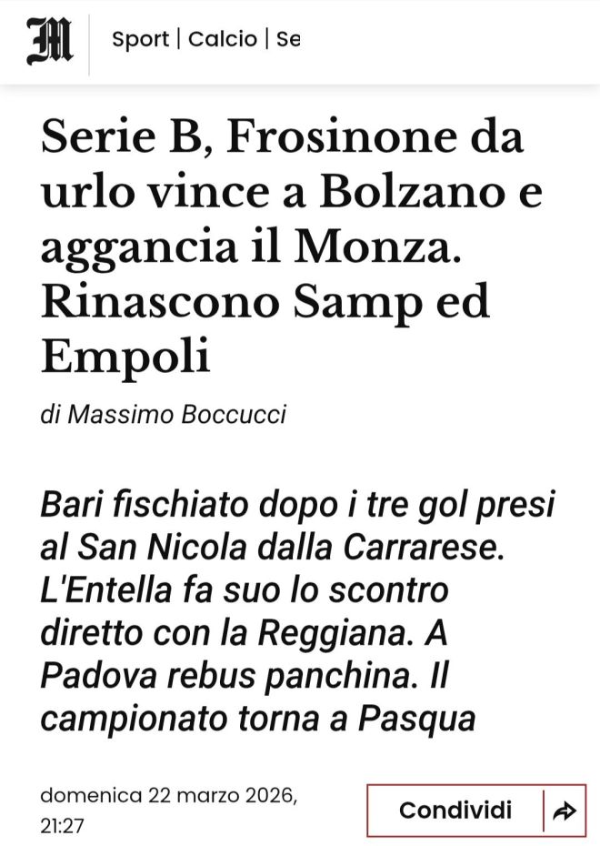 Torna di forza anche il Frosinone nella lotta per la promozione diretta in Serie A. La squadra di Massimiliano Alvini, nella domenica che ha chiuso la 32ª giornata in B con la sosta per le Nazionali che farà tornare il campionato per Pasqua, ha sfruttato il pareggio nel big match tra Monza e Venezia vincendo per 3-1 a Bolzano contro il Sudtirol per agganciare i brianzoli di Paolo Bianco al 2° posto con 65 punti, a -3 dal Venezia capolista. L’attaccante Raimondo al Druso sblocca subito il risultato, poi nella ripresa Palmisani neutralizza un rigore di Casiraghi ma Pecorino sulla ribattuta pareggia i conti, quindi la risposta perentoria di Calò su punizione, con la complicità del portiere Adamonis, e la rete di Ghedjemis. Gli altoatesini di Fabrizio Castori incassano la 3ª sconfitta nelle ultime 4 partite.