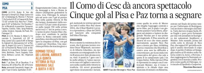 Poco o niente la resistenza dei toscani, che il giovane tecnico svedese Oscar Hiljemark, successore di Alberto Gilardino, sta mestamente accompagnando in Serie B senza aver dato alcuna scossa, visti i 4 punti in 7 gare con 5 ko nelle ultime 6, l’unico successo in casa col Cagliari nella gara precedente e ancora lo zero nella casella delle vittorie in trasferta. Gli errori grossolani agevolano sicuramente i lariani, come quello in avvio di Moreo che sbaglia l’appoggio centrale e serve Diao, per il quale è un giochetto puntare l’area libera, allargarsi sul sinistro e battere in diagonale Nicolas per il suo primo gol stagionale. Il Pisa azzarda ad alzarsi ed ecco che viene punito nuovamente, quando Nico Paz apre a destra per Diao: dribbling in area e mancino che Douvikas a centro area non ha difficoltà a concretizzare, per la 2ª rete consecutiva del greco che sale a quota 12 in campionato (più 3 in Coppa Italia). Nella ripresa il Pisa si ripresenta in campo con il centravanti Meister, ma il Como è spietato e la chiude dopo una manciata di minuti con Baturina, entrato nel finale del primo tempo per l’infortunio di Rodriguez, con un destro chirurgico dal limite. Tutto davvero troppo facile, Pisa fragile e pure poco fortunato per due reti annullate in fuorigioco dei subentrati Stojilkovic e Meister. Solo sussulti, prima del crollo sotto le sferzate di Nico Paz, che segna il 10° gol della serie (più 6 assist) ritrovando il colpo dopo 4 partite (l’ultimo al Sinigaglia risaliva al 19 ottobre nella vittoria contro la Juve), e Perrone. I due raggiungono la Nazionale argentina con il morale a mille. Proprio come quello di Fàbregas, vero incubo di Spalletti e Gasperini.