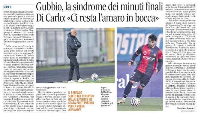 Nella corsa playoff, anche in ottica piazzamento in classifica, questi punti lasciati per strada potrebbero avere un peso specifico notevole. Mimmo Di Carlo si porta dietro le incompiute che hanno tarpato le ali sul più bello. «Come all’andata, questo risultato ci ha lasciato l’amaro in bocca», confessa l’allenatore rammaricato per non aver superato indenni gli ultimi assalti bianconeri, dopo aver visto riaperto la partita nonostante il raddoppio in avvio di ripresa di Podda, che sembrava poter mettere al sicuro il vantaggio di La Mantia. Il Gubbio si è fatto schiacciare troppo e la Juve ci ha creduto fino alla fine. Di Carlo butta la palla in campo avverso sottolineando a mente fredda il valore dell’avversario: «Abbiamo affrontato una squadra di qualità, se la lasci giocare dimostra di possedere un ottimo collettivo. È stata affrontata a viso aperto, non ci siamo presentati per chiuderci, peccato perché già nel primo tempo potevamo raddoppiare ma non ci siamo riusciti».